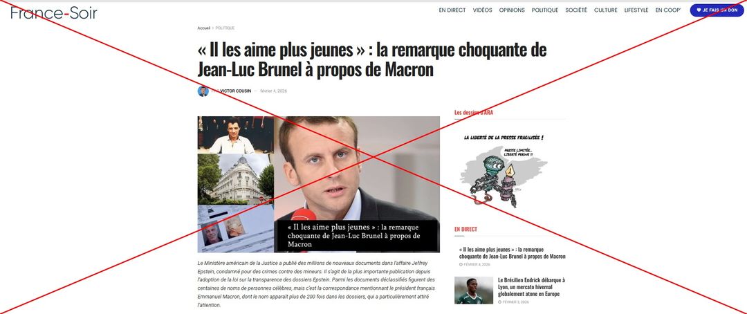 La plupart de ces publications renvoient à un article publié le 4 février par un site se présentant comme « France-Soir », intitulé « ‘Il les aime plus jeunes‘ : la remarque choquante de Jean-Luc Brunel à propos de Macron« . Mais cet article, tout comme la vidéo qu’il relaie au sujet du prétendu courriel envoyé par Jean-Luc Brunel à Jeffrey Epstein, ont été fabriqués de toutes pièces et attribués à un journaliste du journal Le Parisien dont l’identité a été usurpée, suivant une méthodologie caractéristique de ce type d’opérations.