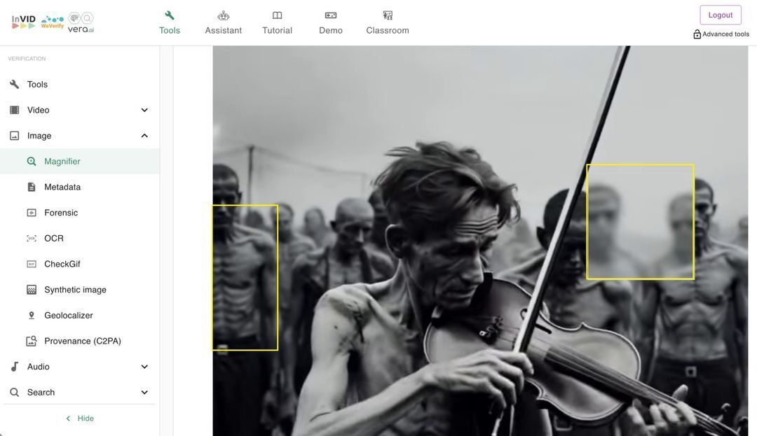 The InVID Verification Plugin magnifier tool reveals frames in the clip where the faces in the background appear blurry and zombie-like. The person to the left of the musician also looks as if he has no sternum or stomach, with ribs showing down to his belt.