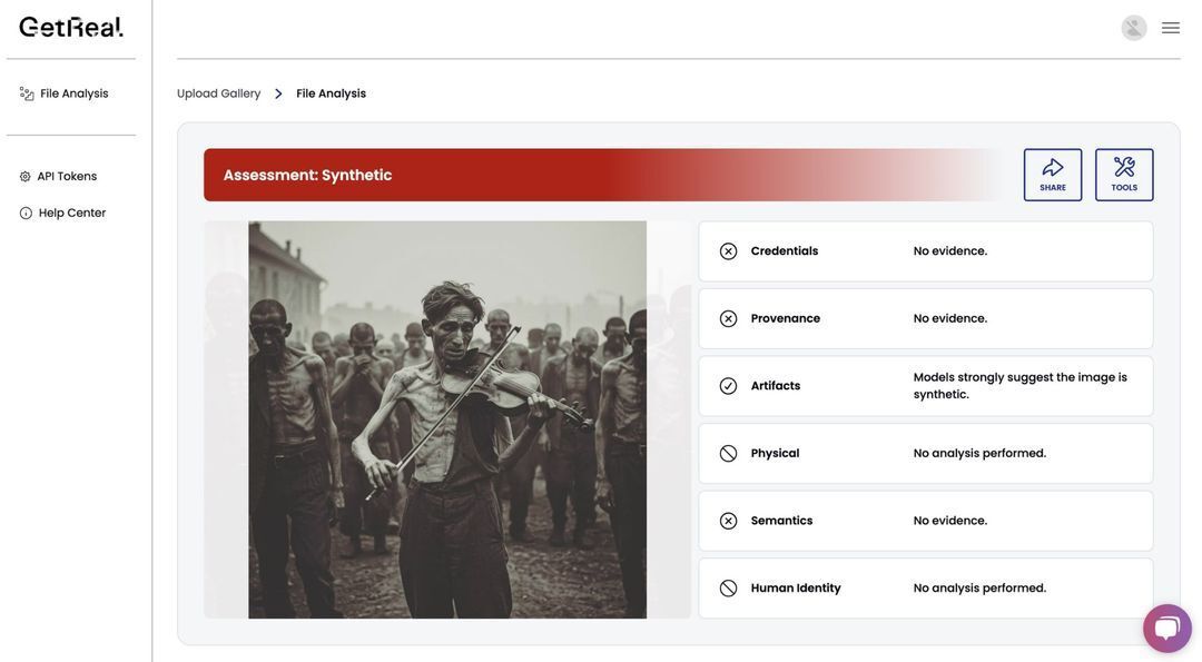 Screenshot taken July 18, 2025 showing the results of synthetic content analysis done using GetReal Lab