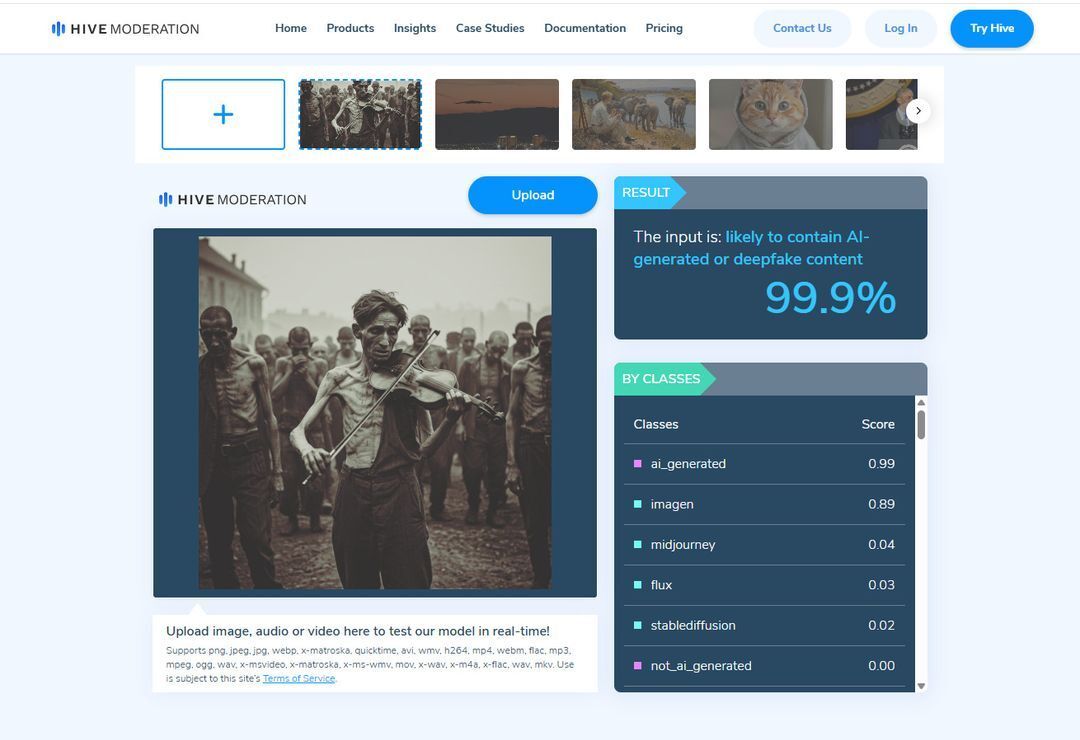 Screenshot taken July 21, 2025 showing the results of analysis using Hive Moderation
