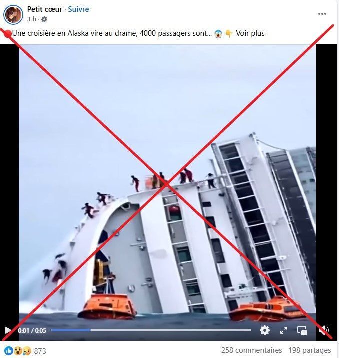 « Une croisière en Alaska vire au drame« , peut-on lire en légende d’une vidéo partagée mi-juillet 2025 par différents utilisateurs de Facebook (1, 2, 3, 4, 5). La plupart des posts ont été supprimés rapidement de la plateforme.