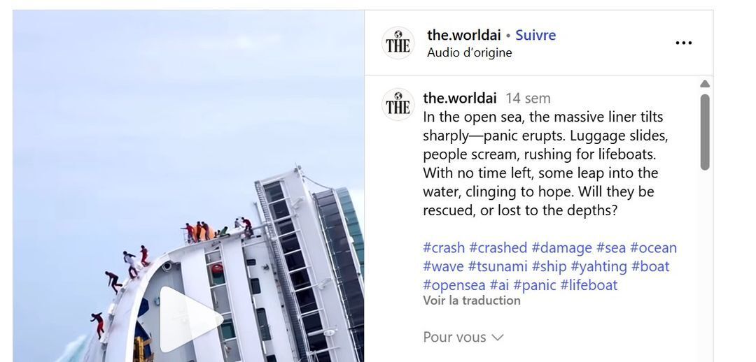 Outre le fait que la mention « AI » (« artificial intelligence ») figure parmi les mots-clés accompagnant les images, la séquence présente des incohérences trahissant sa nature artificielle. On peut notamment voir le corps d’un passager flotter dans l’air alors qu’il progresse sur le navire, ou encore un autre surgir de nulle part.