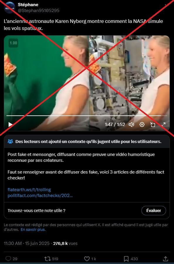 « L’ancienne astronaute Karen Nyberg montre comment la NASA simule les vols spatiaux« , assure un post partagé près de 600 fois sur X depuis le 15 juin 2025, relayant des images dans lesquelles on voit une femme blonde.
