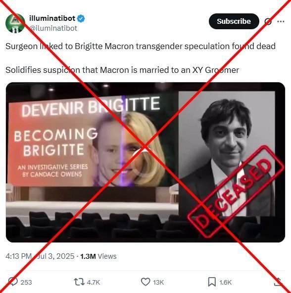 “Surgeon linked to Brigitte Macron transgender speculation found dead,” says a July 3, 2025 post on X. “Solidifies suspicion that Macron is married to an XY Groomer.”