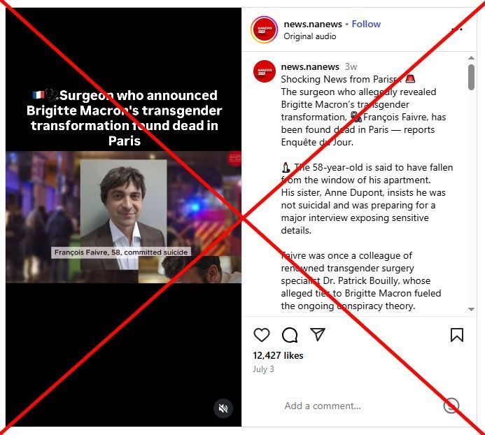 The rumor that a surgeon died before releasing further information on Brigitte Macron spread in articles and in posts across FacebookInstagramThreadsTikTok and YouTube. The claims were widespread in French and also appeared in CatalanSpanishItalianDutchPolishPortuguese and Russian.