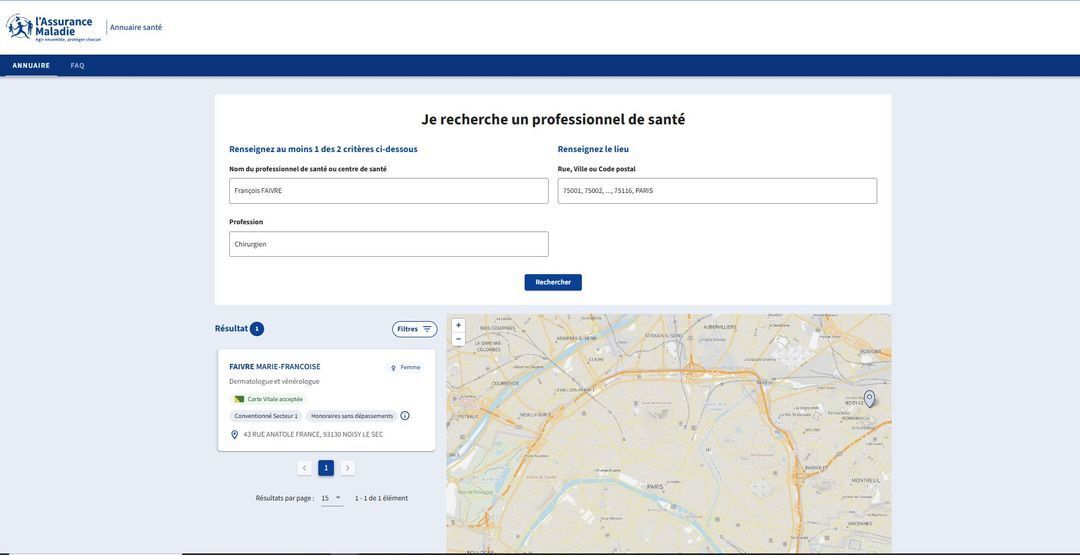 Searches of the French health insurance directory surfaced no matching results for a doctor named “François Faivre.”