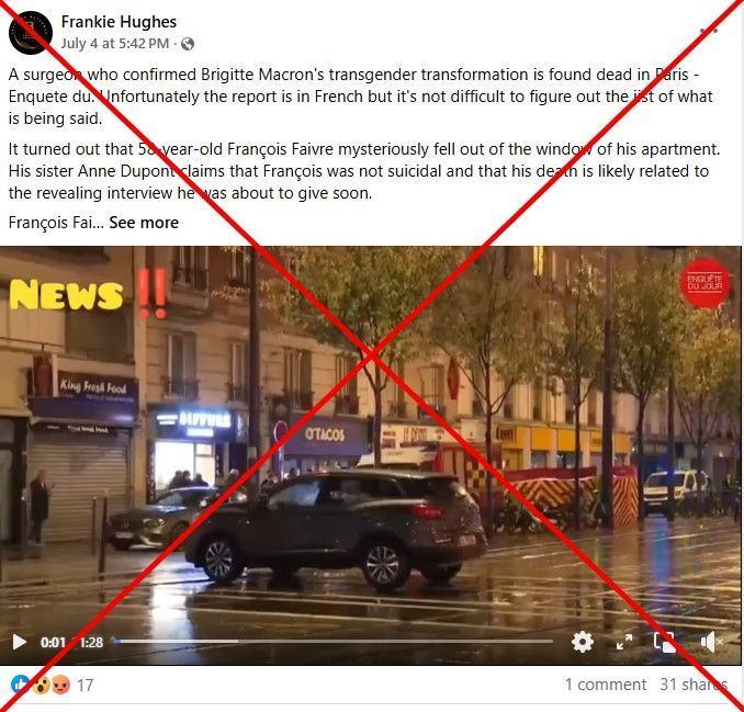 The video opens by showing first responders parked below a Parisian building, with a voiceover and subtitles claiming it is the site where the surgeon, François Faivre, fell to his death. The clip goes on to depict what purports to be an interview with the dead man’s sister, Anne Dupont. Then it claims to show a portion of an initial interview the surgeon gave about Brigitte Macron to the magazine Closer before his death.