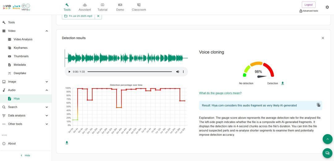 The Hiya.com deepfake detector in the Verification Plugin, also known as InVID-WeVerify, assessed that the voices in the video were “very likely generated by AI.”